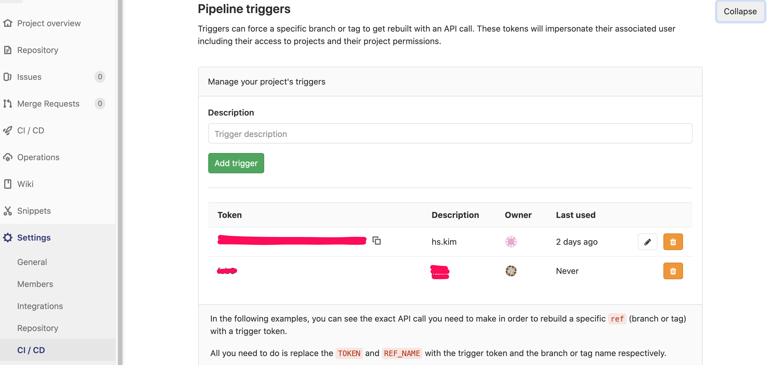 .gitlab-ci.yml 스크립까지 작성했으므로 실제 pipeline triggers token 생성하여 API를 사용해보겠습니다. 프로젝트의 Settings에 CI / CD의 Pipeline triggers탭을 누르면 해당 프로젝트의 triggers Token을 생성해줍니다.