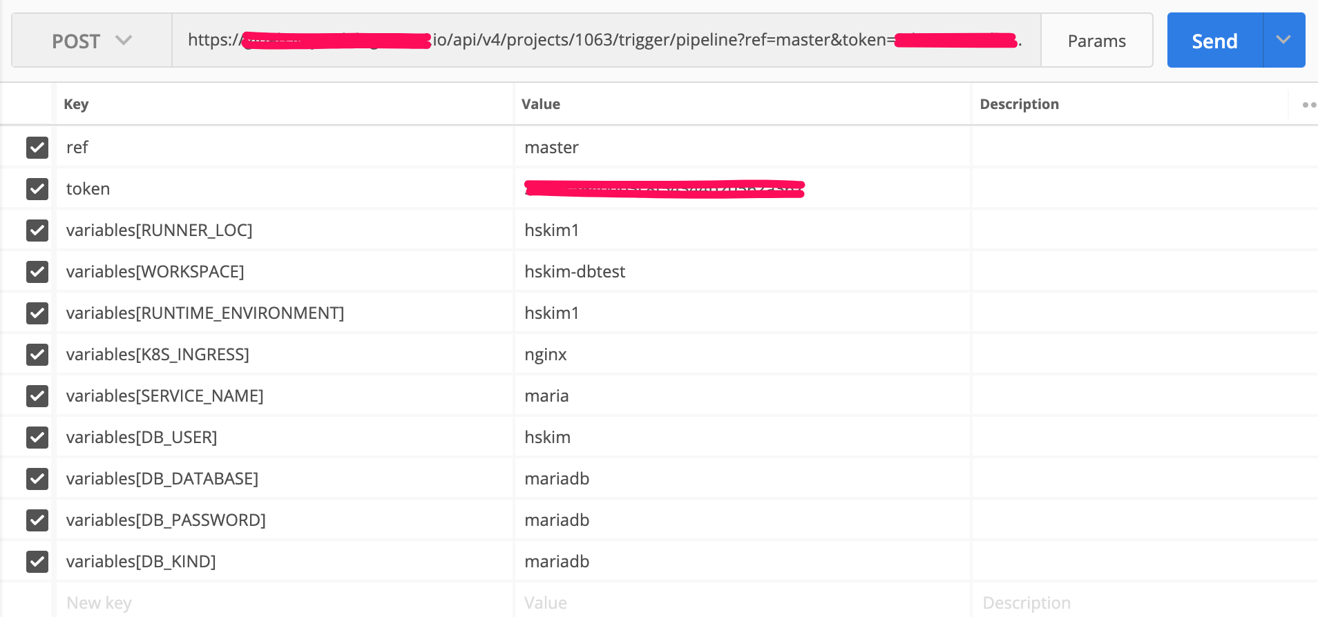 □ .gitlab-ci.yml 파일에서 사용 될 변수와 값을 정의합니다. DB_SERVICE_VERSION 처럼 값을 지정할수도있고 SERVICE_NAME 처럼 ${SERVICE_NAME}으로 값을 채울수있도록 해줄수도 있습니다. 해당값은 추후에 API로 요청을 보낼때 값을 주입시켜줄 것입니다.